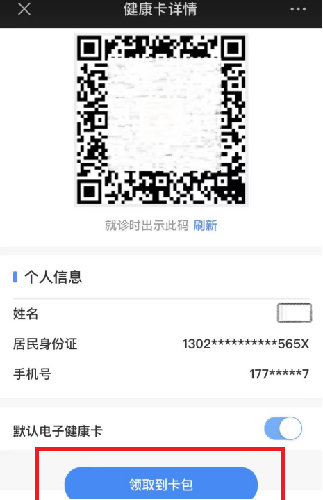 申領成功后,點擊電子健康卡界面,將打開二維碼。該二維碼為在我院就診時的電子憑證,可在醫院門診完成全部就診流程。為了方便就診,可以點擊“領取到卡包”,將電子健康卡存入微信卡包便于出示。
