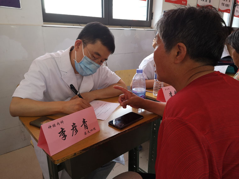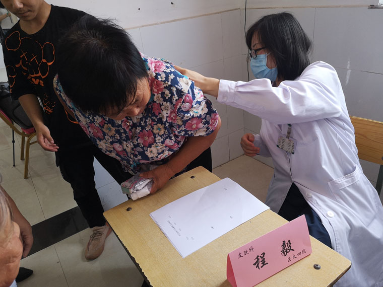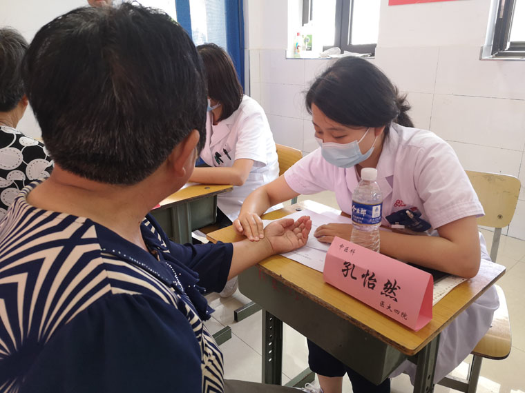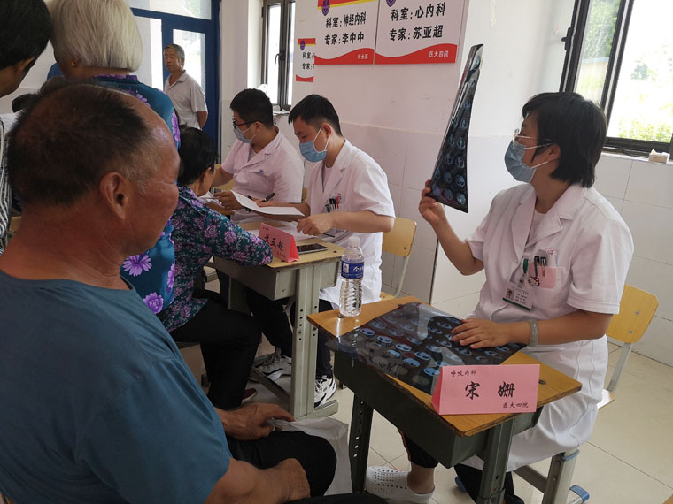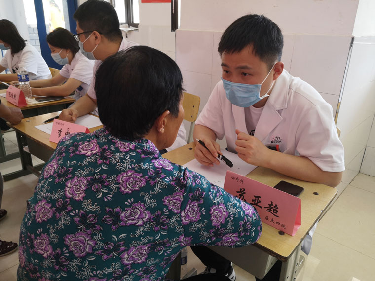 經過長途跋涉,隊員們按時抵達指定地點,迅速進入工作狀態。面對絡繹不絕的群眾,大家分工明確、有條不紊,通過認真詢問、仔細閱片、聽診號脈,為村民們答疑難、講知識、定方案,并針對相關健康管理方面注意事項進行宣教。本科學生們還就當地群眾高血壓、高血糖的發病、診治等情況開展社會調查。