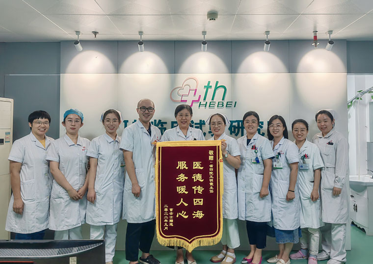 曹女士說:“參加這項臨床試驗,從最初的惴惴不安到現在的安心落地,主任及其團隊的盡職盡責讓我對治療充滿信心。他們總是耐心、細致地講解試驗流程,這次又費心費力幫助我在疫情封城的情況下如期參加了試驗治療,令人感動。因此,我特意送來了錦旗以表達對臨床藥理研究部王明霞主任、劉云飛護士長及全體研究團隊的感謝。”
