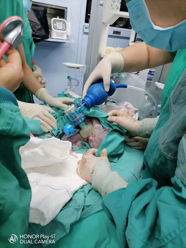 經過綜合評估孕婦病情,診斷為妊娠期高血壓性心臟病心功能III級、重度子癇前期,妊娠風險等級為高風險(紅色標識),孕婦已經出現合并癥和并發癥,病情危重。東院產科隨即與麻醉科賈麗主任、新生兒科沈穎主任、手術室李淑軍護士長積極溝通,組織科室會診,各科專家達成統一意見,在充分做好備血、新生兒窒息復蘇等各項準備情況下立即進行剖宮產終止妊娠,同時制定了縝密可行的手術麻醉方案及術中、術后突發情況的應對措施。
