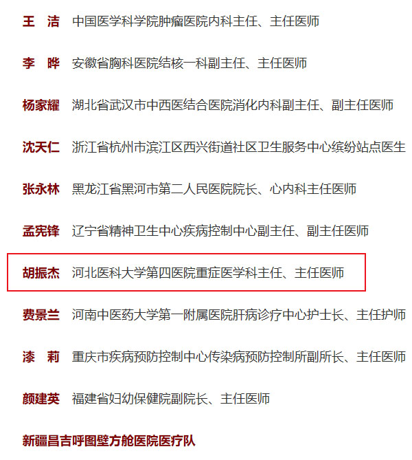 胡振杰,男,漢族,1964年1月生,中共黨員,主任醫師、教授、博士生導師,現任河北醫科大學第四醫院重癥醫學科主任,河北省醫學會重癥醫學分會主任委員,河北省新冠肺炎醫療救治專家組副組長。從醫近40載,屢次臨危受命,趕赴新冠肺炎疫情以及非典、禽流感、甲型HIN1流感、非洲埃博拉病毒等國內外重大公共事件、突發事件的第一現場,挽救了上萬名危重患者的生命。他帶領的科室被衛生部首批授予“國家臨床重點專科”稱號;培養近600名進修醫師、護士,100余名研究生,會診的病人超過20000名,整體搶救成功率近90%。