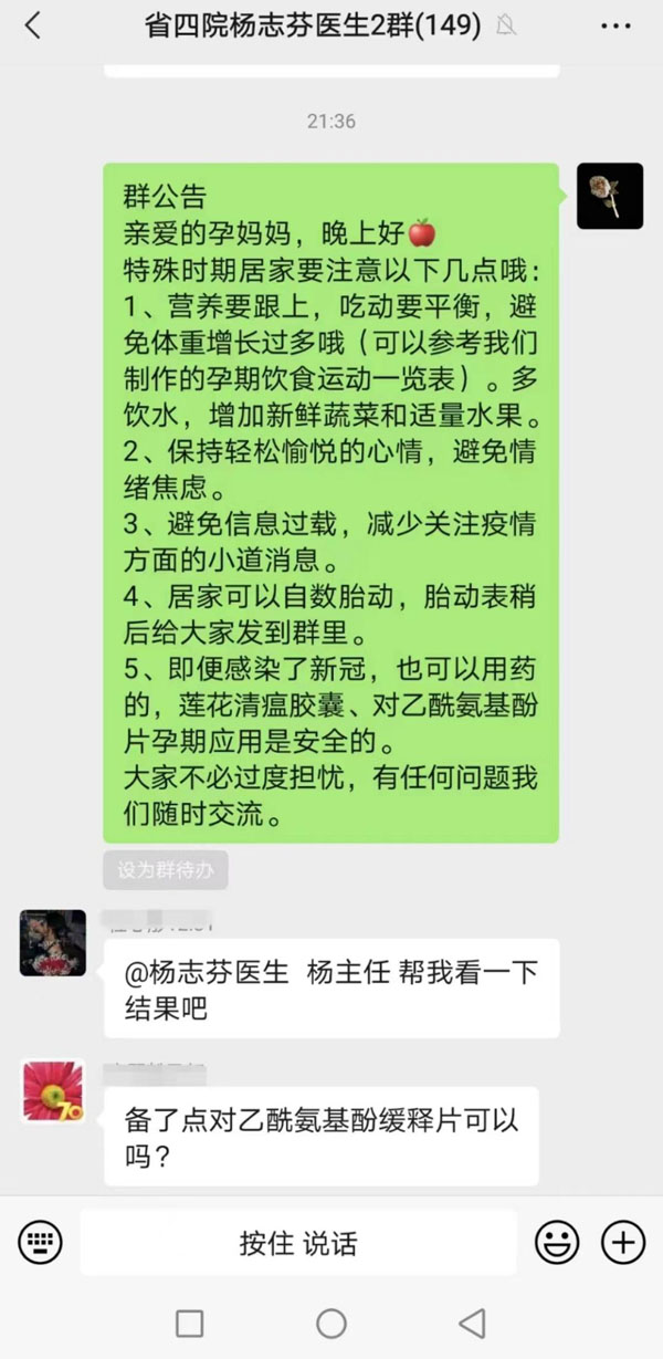 隨著疫情防控形勢的變化,產科迅速調整門診及住院就診流程,保證危重癥及急危重癥孕產婦生命安全。本部病房、產房迅速劃分兩區有效保證了病人住院后迅速進入治療。同時,東院產科通過調研發現,有孕婦的家庭存在較大的顧慮。這些擔憂一方面是孕產婦該如何做好健康防護,另一方面則是母嬰安全是否會受到威脅。為緩解孕媽媽們的不安和焦慮情緒,幫助孕產婦順利度過孕期,楊志芬副主任組織科室醫護人員,成立了線上咨詢小組,通過微信群規范開展咨詢和健康教育,內容包括向孕產婦科普孕期新冠相關知識、特殊時期的飲食運動指導、心理疏導以及門診預約工作等。在微信群,還通過每日打卡的形式督促孕產婦合理飲食、適當運動,助力其平穩度過孕產期。通過線上線下相結合的方式,東院產科讓特殊時期的診療更接地氣,更有溫度。此外,東院產科嚴格按照醫院的疫情防控部署安排,全力配合完成病區的搬遷和病室改造。