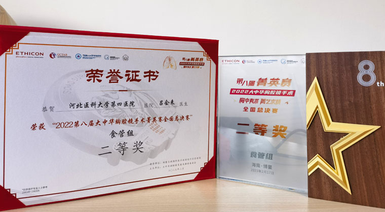 在“第八屆大中華胸腔鏡手術菁英賽”系列比賽中,東院區胸心外科病區副主任呂會來分別以腔鏡食管組手術省內選拔賽第一名、晉冀蒙賽區第一名,北中國賽區第一名的成績晉級全國總決賽。來自海內外的116名胸外科領域權威專家組成總決賽評委團,呂會來醫生秉承“嚴于術前、精于術中、善于術后、綜合展示”的手術理念,用英文呈現了1例局晚期食管鱗癌經綜合治療后成功微創手術的案例,得到評委的一致認可,獲得全國二等獎的好成績,充分展示了我院胸外科的綜合實力。