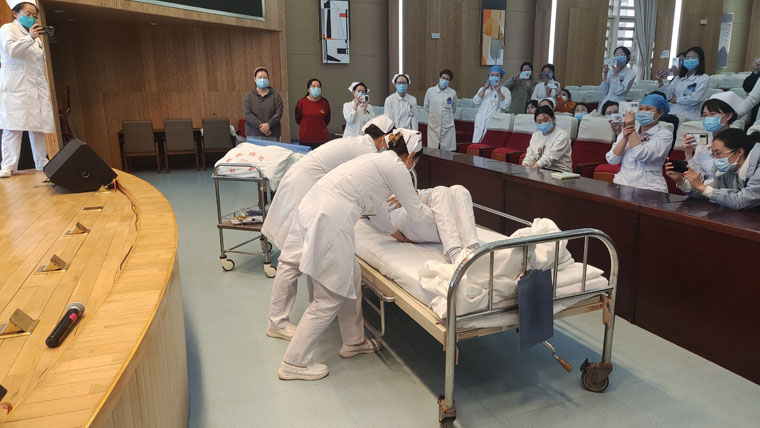 皮膚管理學組培訓分為理論授課和工作坊兩部分。理論授課內容圍繞“重癥患者常見皮膚問題”“壓力性損傷概述及預防”開展。在工作坊環節,陳曉娜護士長和張書穎護士長演示了翻身的流程及注意事項,大家積極圍觀并討論總結臨床減壓的方法,互相借鑒,學以致用。