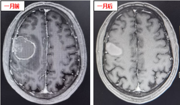 患者在接受3次射波刀治療后,頭痛癥狀明顯減輕,癲癇癥狀消失,肢體肌力明顯好轉。接受治療1個月后,患者肢體肌力恢復正常,未再出現口角、肢體抽搐及頭痛、頭暈等癥狀,僅左側手指尖偶有麻木感。復查頭顱核磁顯示:顱內病灶明顯縮小,周圍無明顯水腫壞死征象,安全性良好,這意味著射波刀治療成功遏制了顱內轉移瘤。