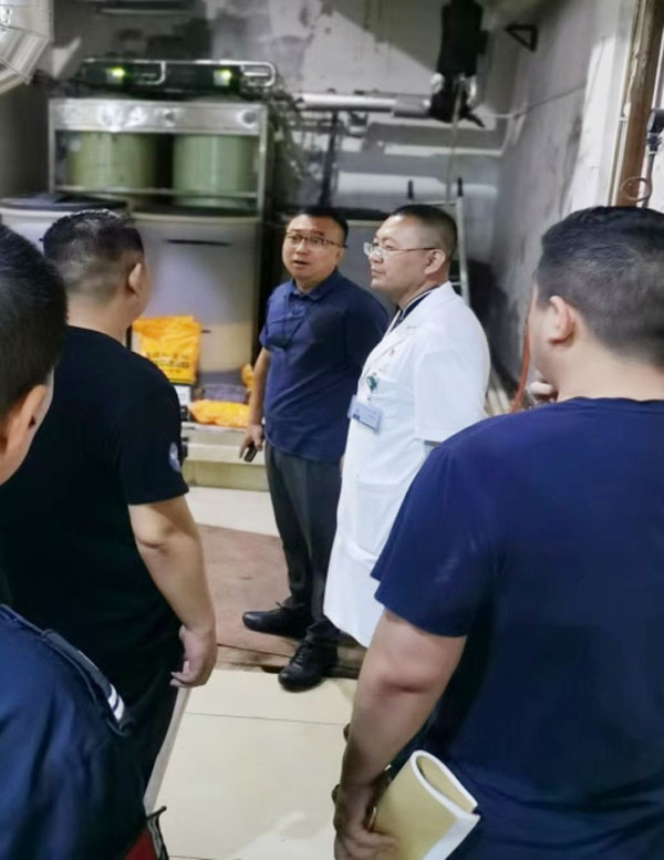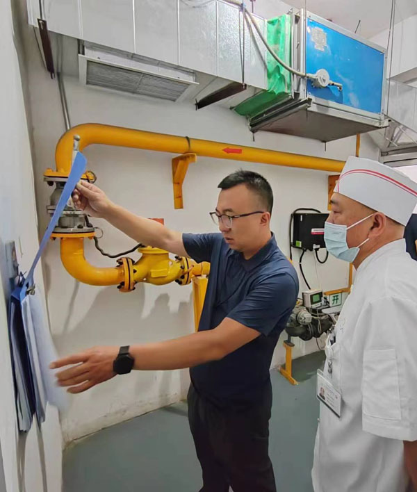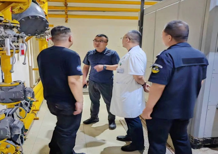 檢查組一行先后到南樓制氧機房的燃氣鍋爐房、污水站、新醫技病房樓負一膳食部進行排查,查看規章制度與安全警示標牌、燃氣檢漏、應急設施狀態、鍋爐房內安全和消防設施設備配備、食堂燃氣安全管理等,并對涉及有限空間作業標識設置、作業審批、安全交底和防護救援設備等情況詳細檢查。