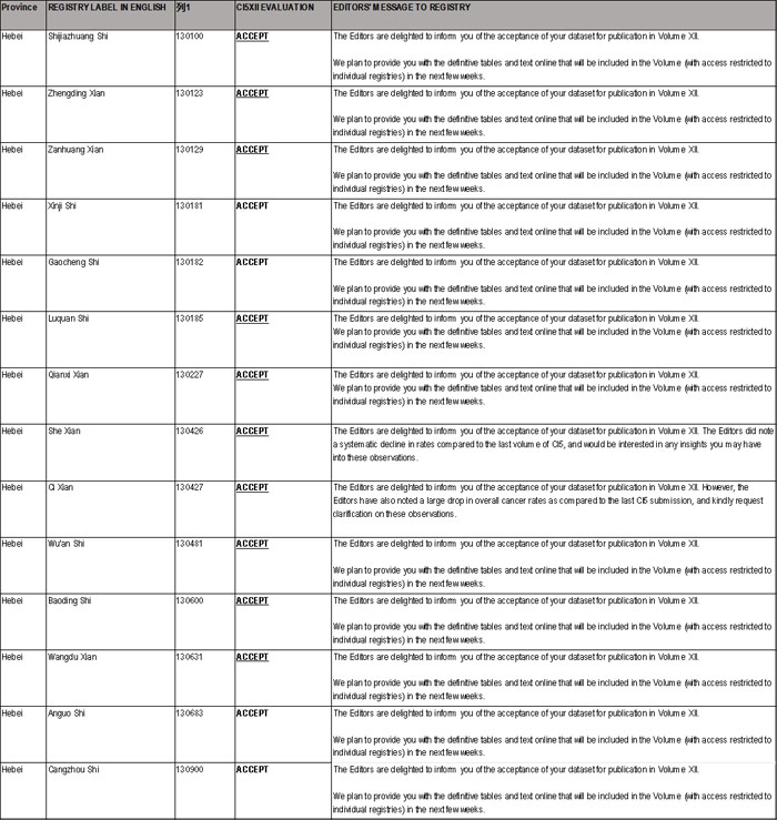 河北省14個登記處被《五大洲癌癥發病率》第12卷收錄情況