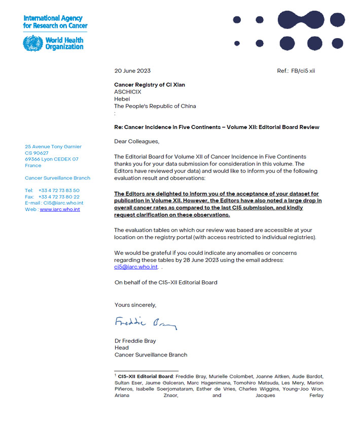 日前,2022年河北省腫瘤防治辦公室(設立于我院)向國家癌癥中心提交的河北省14個腫瘤登記處2013-2017年腫瘤發病數據,被國際癌癥研究機構(IARC)出版的專著《五大洲癌癥發病率》第12卷收錄。本次共收錄中國156個腫瘤登記處的數據,我省也成為全國第三大被收錄省份,創造了河北省腫瘤登記工作新的里程碑。