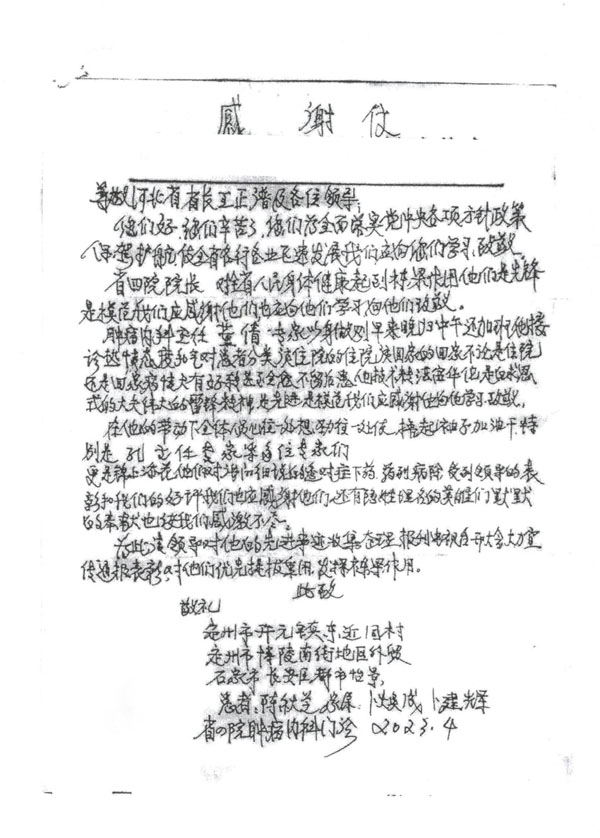 “注重人文關懷,構建和諧醫患”一直是我院不懈的追求,近日,我院收到一名"特殊"患者的感謝信,該信得到河北省政府、河北省教育廳及河北醫科大學領導的批示,字里行間對腫瘤內科史健教授、魏素菊教授、董倩副教授、孔雁副教授熱心周到的診療服務及科室全員積極向上的精神風貌表示連連稱贊。在醫院黨委的正確領導下,腫瘤內科深入貫徹“大健康”理念,全方位全周期守護患者群眾的生命健康,以實際行動推動醫院高質量發展。