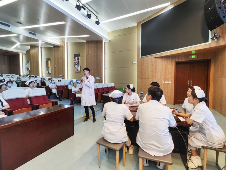 為規范護理教學查房流程,提高臨床護理教學能力,8月1日,護理部在新醫技病房樓報告廳舉辦“醫護融合護理教學查房展示活動”。外三科劉慶偉副主任醫師、帶教老師李曉娜及5名實習生組成查房展示團隊,護理部李來有主任,護理教學辦公室李志紅主任、范曉丹老師以及全院各科護士長、帶教老師、教學骨干和部分實習生300余人參加。本次培訓得到外三科的幫助和支持。