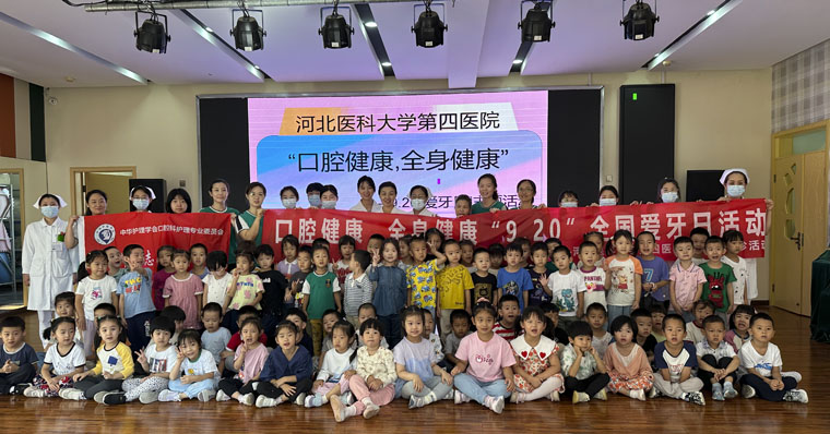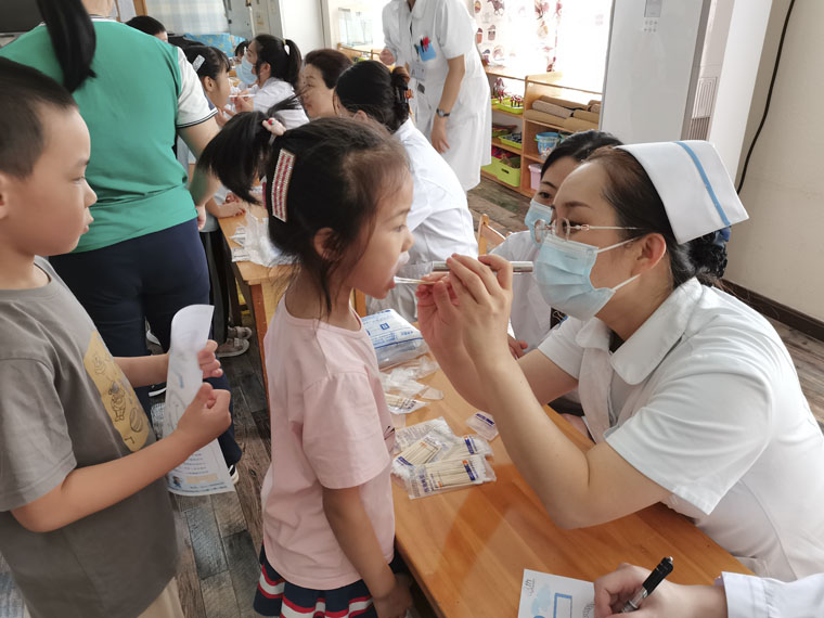 為幫助兒童養成良好的口腔習慣,在東院口腔科門診主任劉健,東院區口泌病區護士長金婷婷及口腔科護士長劉偉的帶領下,多位醫務人員前往某社區幼兒園開展義診宣教活動,為215名幼兒進行口腔檢查,教孩子們學唱朗朗上口的刷牙歌,示范正確的刷牙方法,引導孩子們早晚正確刷牙,鼓勵大家爭做一個口腔健康的好寶寶,并向家長發放愛牙宣傳資料。