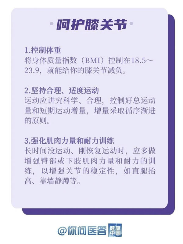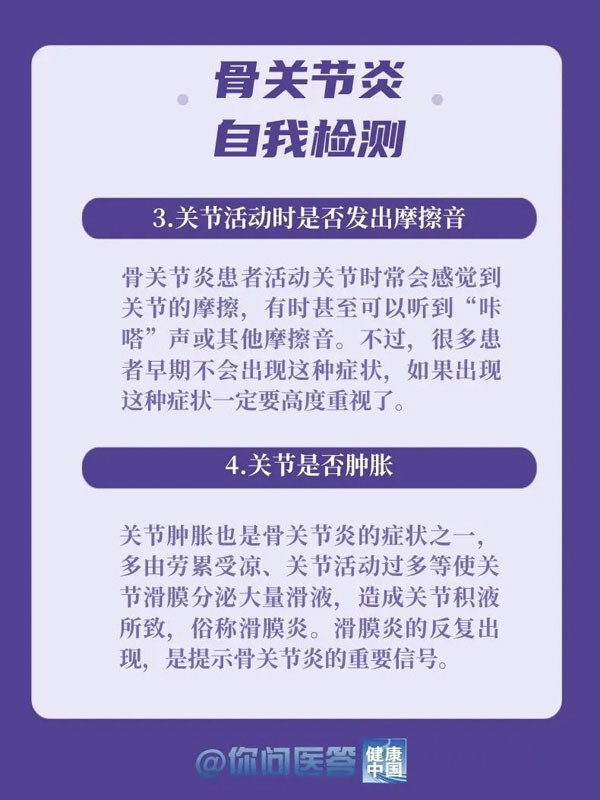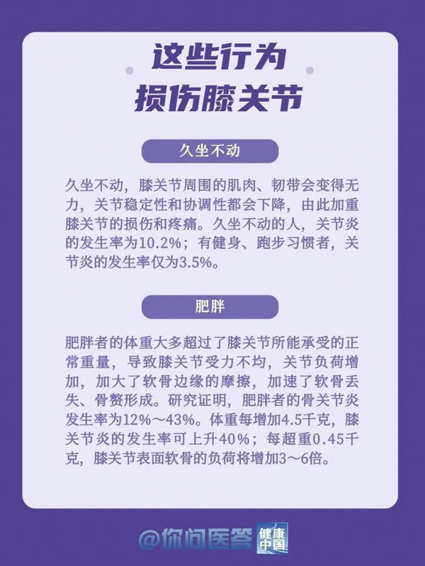 10月12日是世界關節炎日。關節炎是常見的慢性疾病之一。關節炎的種類繁多,其中以骨關節炎患病率最高。骨關節炎好發于負重關節及活動量較多的關節,如膝關節、髖關節等。你的膝關節還好嗎?生活中,有哪些常見的“傷膝”行為?保護關節,轉給你關心的人!