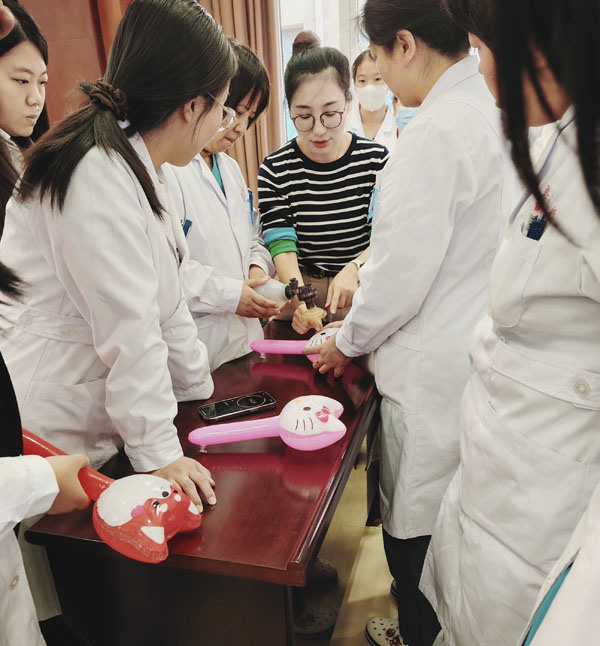 實操環節,楊志芬副主任從基礎解剖結構、盆腔血管走行講起,并結合提前錄制的操作視頻和子宮模型現場操作,直觀、清晰地講解了規范的子宮切口縫合技巧以及各類手術止血方法。劉艷華醫師就新生兒復蘇要點進行手把手指導,并指導團隊協作,提高新生兒窒息復蘇救治水平。培訓期間,特別采用卡通氣球替代復蘇囊演練新生兒復蘇,既克服了購買模型的費用問題,又提高了模型的仿真度。現場氛圍熱烈,大幅提升了學員的學習積極主動性。