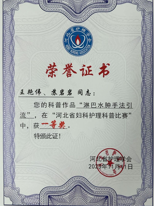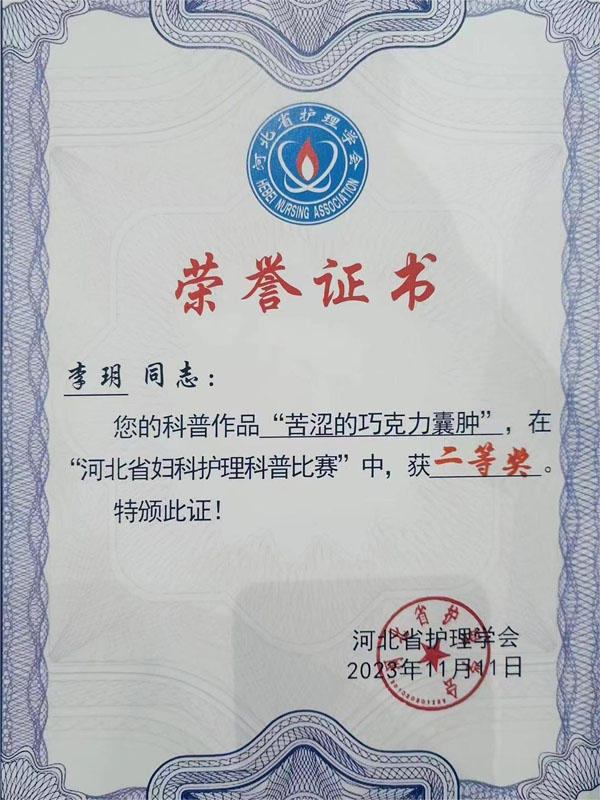 11月9日—11日,河北省護理學會婦科專業委員會在石家莊市召開“河北省婦科護理新進展研討會暨盆底康復技術研討會”。會議前期面向全省征集優秀科普作品,共78個作品入圍復賽,經過激烈的角逐,我院婦一科王艷偉、蘇巖巖的作品《淋巴水腫手法引流》和李玥的作品《女性“生育之敵”巧克力囊腫》脫穎而出,分別在決賽中獲得一等獎和二等獎的優異成績。