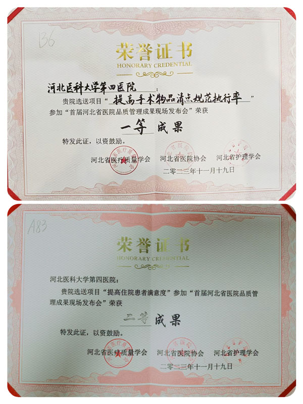 11月17—19日,由河北省醫療質量學會、河北省醫院協會、河北省護理學會共同舉辦的“首屆河北省醫院品質管理成果大賽”在石舉行。經過激烈角逐,東院手術室護士周俊杰的《提高手術物品清點規范執行率》、東院放療科護士盧霄蒙的《提高住院患者滿意度》分獲一等成果獎和二等成果獎。