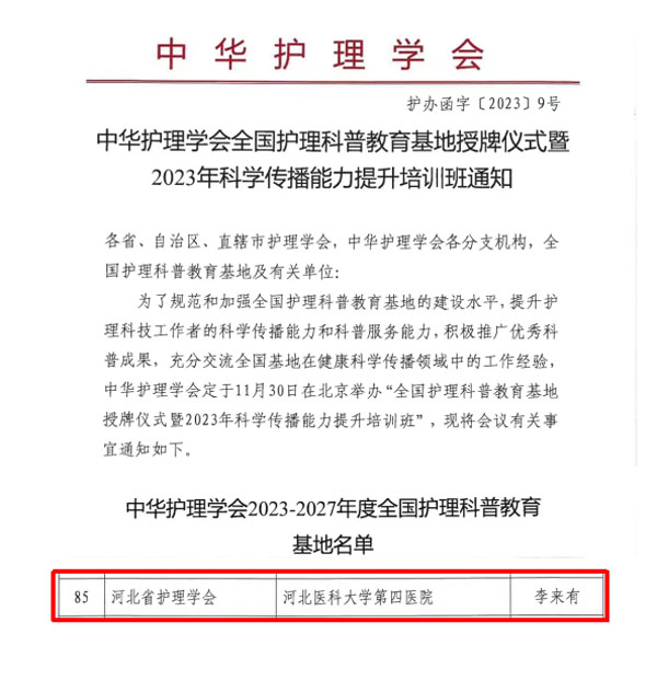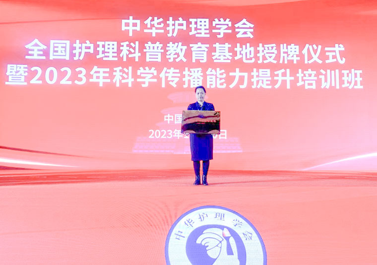 11月30日,中華護理學會在北京舉行全國護理科普教育基地授牌儀式暨2023年科學傳播能力提升培訓班,我院成功獲批“全國護理科普教育基地”。