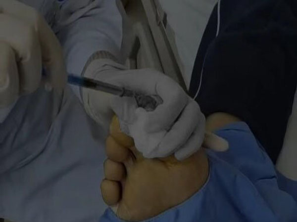 該患者足趾部創面長期不愈,輾轉多家醫院未見好轉,來我院后,經血管評估,患者脛前動脈血流欠佳,存在嚴重的神經病變。因自身原因,患者未能行介入治療開通血流,故轉而進行臍血單個核細胞移植,以改善下肢供血及神經修復。治療后,患者足部創面局部肉芽組織生長依舊欠佳,故予以自體富血小板血漿治療,經臨床觀察,效果顯著,肉芽組織生長良好。