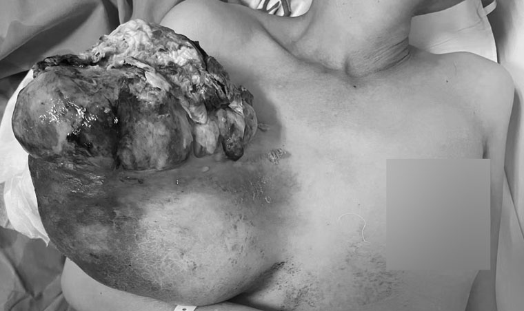 患者為一名53歲女性,自述右乳腫物已有3年。近3個月迅速增長至“足球”大小,且出現破潰、感染、出血,嚴重影響日常生活。經過當地兩家醫院問診,均被告知無法治療,建議轉上級醫院。患者來我院乳腺中心專家門診就診時,體貌消瘦,面容貧血,雙手托著乳房腫物,腫瘤潰破出血浸透了包裹多層的紙巾和護墊,可以聞到濃烈的傷口腐敗味道……耿翠芝教授對患者進行詳細檢查發現,除皮膚脫水、無彈性外,患者營養狀況極差且伴有心率快、血色素低、水電平衡紊亂等問題。