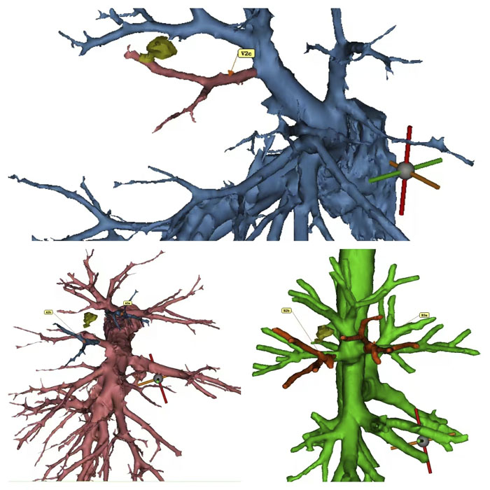 患者為一名50歲女性,體檢發現右肺上葉有一枚高危結節,需要盡快手術治療。醫生借助三維CT支氣管血管重建(3D-CTBA),發現結節位于右肺上葉前段外亞段與后段外亞段之間,為保證手術切緣并達到手術根治性,需行S2b+S3a切除術。