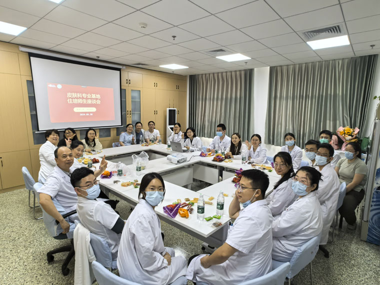 座談會圍繞醫患溝通、教學活動、臨床與科研等話題展開,氛圍輕松愉快,教師們毫無保留地分享自己的“皮膚科之路”,學員們敞開心扉、暢所欲言,表達了科室培訓期間的感受和收獲,也為皮膚科住培教學工作的發展建言獻策,同時提出了臨床、科研和生活中的困惑。老師們悉心傾聽大家的感受并答疑解惑。幾位即將畢業的住培學員表示,住培學習的經歷難忘且寶貴,要珍惜每一次的學習機會,保持熱愛、堅持不懈,爭取早日成為一名優秀的醫生。