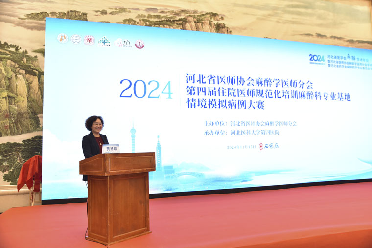 大會開幕式由河北省醫師協會麻醉學醫師分會會長、我院麻醉科賈慧群教授主持。她表示,本次比賽初步應用AI技術,并加強了人文素養的考評,希望選手輕松上陣,展示基地培訓效果,充分享受比賽過程,共同提高。