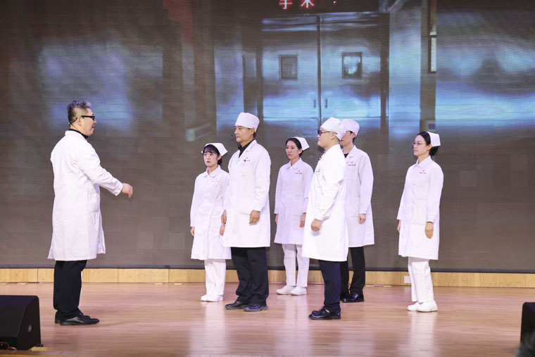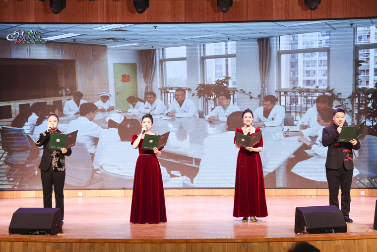 隨著離退休黨總支激昂的大合唱《祝福祖國》音樂響起,演出正式拉開帷幕。整場聯歡會巧妙構思,分為上下兩個篇章,形式豐富,亮點頻現。上篇以“勇擔使命 砥礪奮發”為主題展開:歌伴舞《美麗中國年》生動詮釋了新春的歡騰喜悅;四重唱《春風十萬里》旋律悠揚,傳遞春天的希望與溫暖;心外科負責人趙永波以《心懷感恩,與愛同行》為主旨,通過深情真摯的講述,展現了一名外科醫生的擔當和醫患間的溫暖,令人動容;豫劇《朝陽溝選段》經典再現,彰顯傳統文化魅力;歌伴舞《如愿》深情表達了愛與希望;情景劇《跨越四十年的就醫之旅》細膩刻畫了“醫”路傳承和醫患間的緊密聯系,突顯了胸外科手術技術四十載的飛躍式發展。