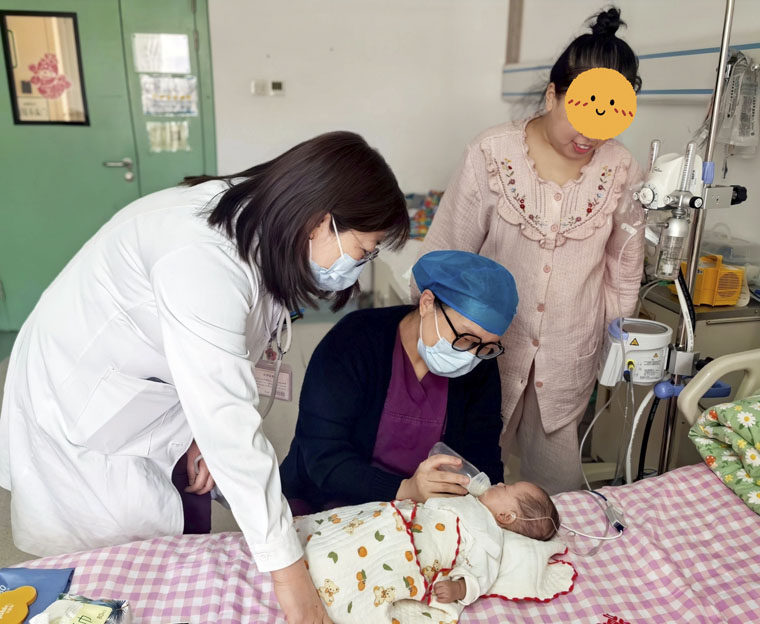 在新生兒病區,兩個出生時僅25周的超早產兒,因支氣管肺發育不良,不能離氧,需要醫護人員實時監測看護。由于吃奶不協調,為防治出現嗆奶造成窒息,從NICU轉入母嬰同室后,醫護人員陪伴著寶寶和家長,配奶、喂奶、喂藥、換尿布……每一個環節嚴格把控,耐心指導。在大家的共同努力下,兩個寶寶平安度過了春節,體重增長良好。