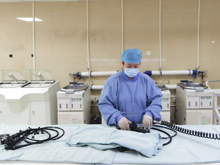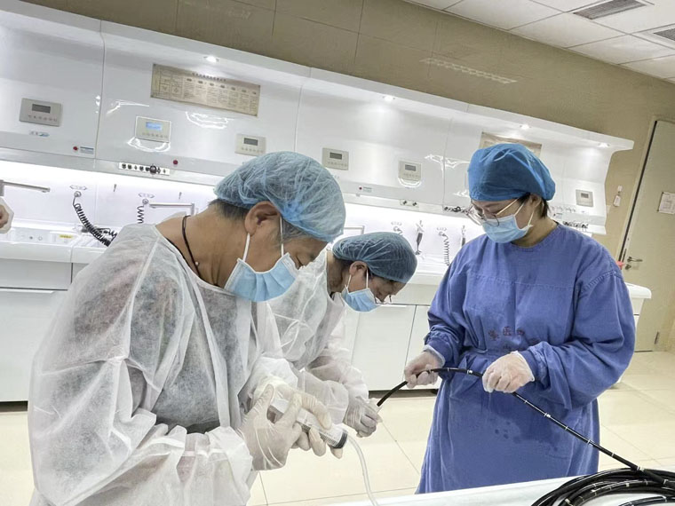 “請問內鏡檢查會感染傳染病嗎?消毒徹底嗎?”這是很多患者就診前普遍考慮的問題。“藍”護士承擔著內鏡再處理工作,從預處理開始到干燥結束,洗消過程繁雜,晨消工作檢查胃腸鏡上洗消機,每天的診療結束后,再將內鏡全部干燥送進儲鏡室,保證每條內鏡必須滿足儲存的標準。