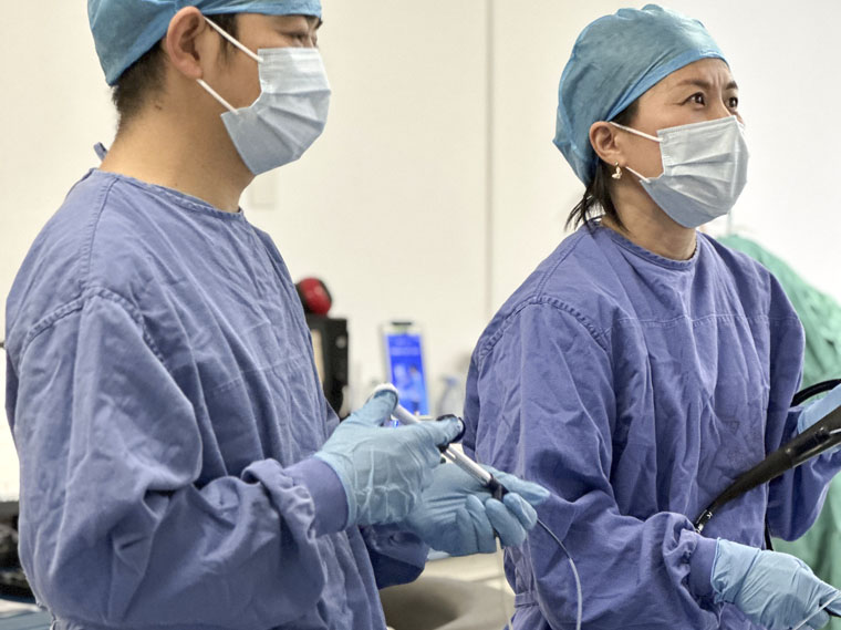 熟練掌握各種手術器械是“藍”護士的看家本領,我們充分了解每款手術器械的型號、使用方法,在術中我們要預見性地知道醫生的下一步操作,想醫生之所想。當看到病變創面噴涌的鮮血噴射時,我們會化身為醫生的“第三只眼”,緊盯屏幕,協助醫生找出血位置,精準快速夾住血管。