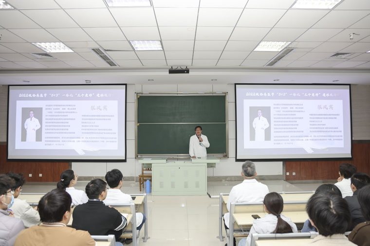 2022級麻醉學專業本科班學業導師、麻醉學系主任賈慧群教授向同學們介紹了麻醉學科的歷史和發展前景,讓大家對麻醉學科有了初步認識,對于在AI時代下如何深耕于麻醉專業提升個人崗位勝任力有了信心與方向。2022級臨床醫學“5+3”一體化班學業導師張風賓教授以《從課堂到臨床--醫學長跑的第一公里》為題與同學們分享醫學學習之路,對同學們如何找到日后的“醫學人設”、如何選擇臨床與科研給予了詳細指導。
