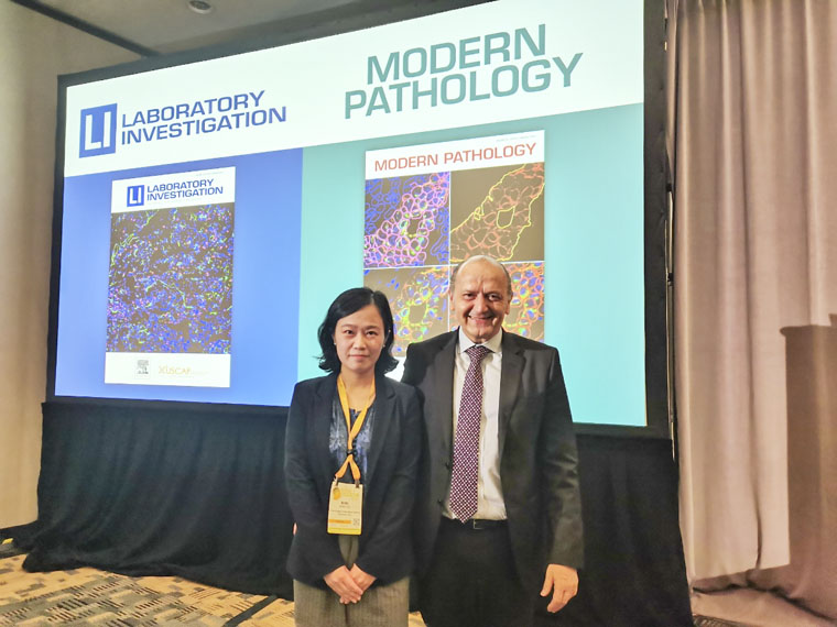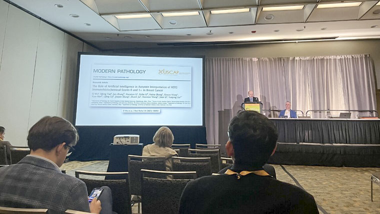 近年來,我院病理科持續緊跟國際前沿,累計獲得7項口頭發言和20篇壁報交流,相關學術成果發表在Modern Pathology、ESMO OPEN、Lab Investigation等國際頂級期刊。特別在2024年USCAP年會中,病理科主任劉月平教授團隊,有關乳腺癌病理人工智能研究入選了全球病理最具影響力的5篇研究,并在“USCAP期刊精選”分會場進行研討,充分彰顯了我院病理科的科研實力。