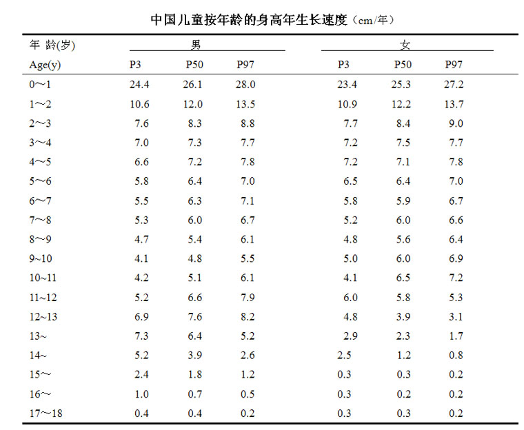 單純以身高的絕對值來定義患者矮身材,可能導致部分患者喪失治療時機。在矮身材出現前,要及時發現生長的異常趨勢,則需要在生長發育的過程中注意監測兒童的年生長速率。嬰幼兒期(3歲以下)生長速率<7厘米/年;兒童期(3歲~青春期)生長速率<5厘米/年;青春期生長速率<5.5~6.5厘米/年,可考慮為生長發育遲緩。