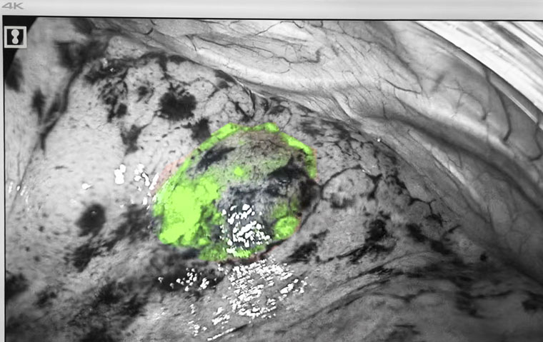 手術在麻醉三科賈麗主任團隊全程保障及東院手術室護理團隊的協助下進行。黃超主治醫師操作電磁導航支氣管鏡,胸科內鏡室張金澤技師長、邊媛媛主管護師全力配合。患者全麻后,醫療團隊經氣管插管進鏡,在電磁導航的實時指引下分別到達兩處病灶位置,并將熒光顯影劑通過內鏡鞘管分別滴注至兩處病灶定位標記,整體操作時間僅10余分鐘。定位后,胸腔鏡手術隨即進行。熒光模式下,在肺表面即可看到定位的熒光顯影標記,術者對病灶進行精準切除。術中快速冰凍病理顯示,右肺上葉前段楔形考慮微浸潤性腺癌,肺上葉后段楔形肺組織內可見纖維化結節,周邊局灶肺泡上皮非典型增生,最終石蠟病理回報吻合口切緣陰性,表示邊緣未發現腫瘤細胞,手術已完整切除病變。