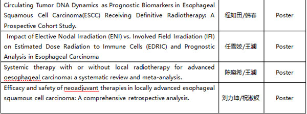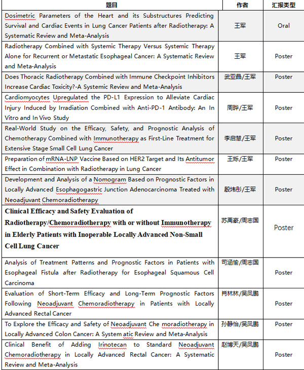 我院放療科王軍教授作為學科帶頭人,帶領各位主任和其團隊提交的多項研究憑借創新性和臨床價值獲得大會高度認可。其中,題為《Dosimetric Parameters of the Heart and its Substructures Predicting Survival and Cardiac Events in Lung Cancer Patients after Radiotherapy: A Systematic Review and Meta-Analysis》的口頭報告,從全球數千份投稿中脫穎而出,向國際同行展示了我院在腫瘤精準放療領域—放射性心臟損傷方面的重要進展。16項壁報展示則分別從放療與系統治療最佳聯合時機及模式、聯合治療毒性管理、生物標志物探索、綜合治療策略等角度,系統呈現了我院在食管癌、肺癌等領域的長期臨床積累與技術儲備。