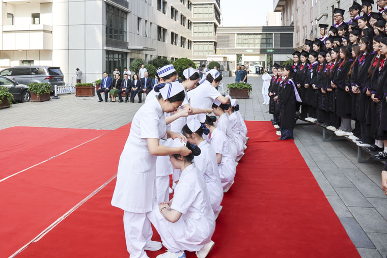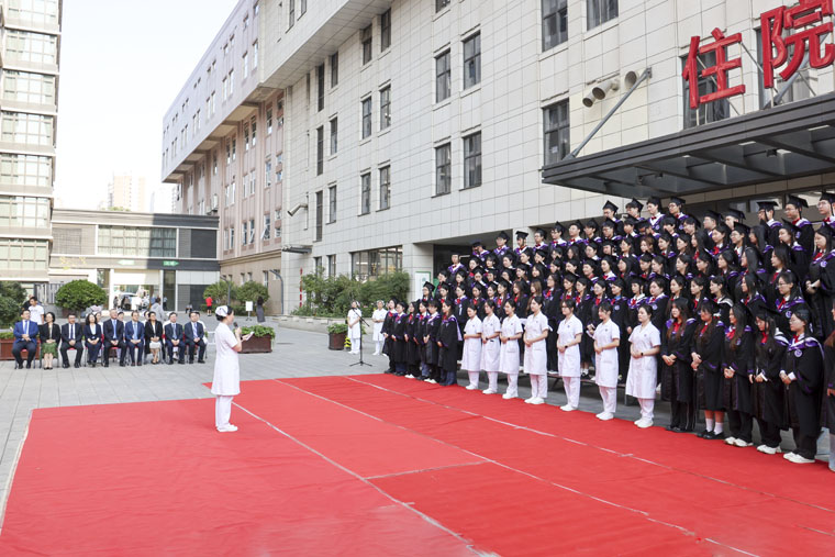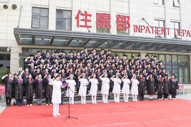隨后,護理學院、護理部、護理教學辦公室的前輩老師為畢業生代表莊嚴授帽。“余謹以至誠宣誓,終身純潔,忠貞職守。勿為有損之事……”河北醫科大學護理學院院長張瑞麗帶領全體同學重溫南丁格爾誓言,同學們以堅定的聲音和虔誠的態度,莊嚴宣告對護理職業的神圣承諾與堅定信念。