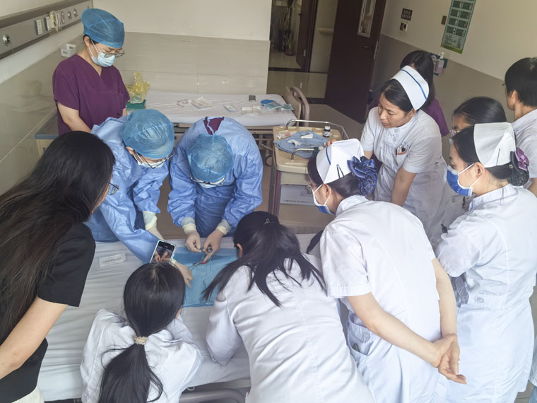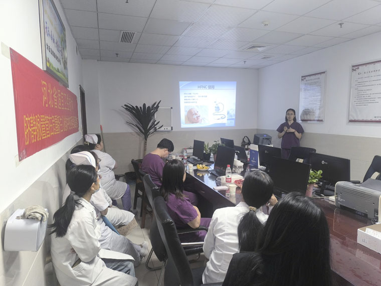 在理論授課環節,刁玉巧主任介紹了我院在新生兒救治領域的主要技術、新生兒臍靜脈置管術的應用進展;張文浩主治醫師講解了臍靜脈置管的技術要點;王瑛瑋護士長分享了臍靜脈置管“細節決定成敗”的護理經驗;許彥平主管護師針對無創輔助通氣操作流程進行細致剖析。實踐操作環節,兒科團隊進行了規范化現場模擬操作演示,手把手教學,從器械準備、穿刺技巧到固定方法,每一個步驟均進行了細致示范與講解,確保參訓醫護人員精準掌握技術要點。針對操作過程中可能出現的問題,現場同步進行答疑解惑。專家團隊還針對該院新購置的呼吸機進行了個性化指導。