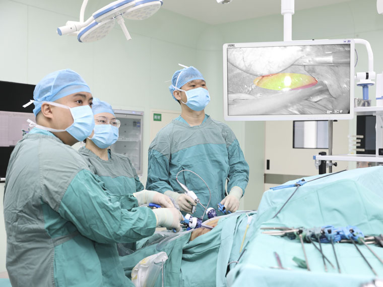 三維重建技術直觀呈現肝段劃分及血管、膽管解剖關系,而熒光顯影技術則通過肝段染色,全程顯露段間靜脈,有助于識別肝內肝段間的界限,使肝膽外科醫師可以全程實時觀察肝臟切面變化,及時作出調整,優化手術方案,實現真正意義上的解剖性精準治療。此外,吲哚菁綠(ICG)經膽道排泄的特性使術中膽管結構呈現清晰綠色熒光,大幅提升膽總管辨識度,有效降低腹腔鏡手術中膽管損傷風險,為復雜肝膽手術安全性再添保障,顯著降低了膽管損傷及相關并發癥的發生率,進一步提升了手術安全性。