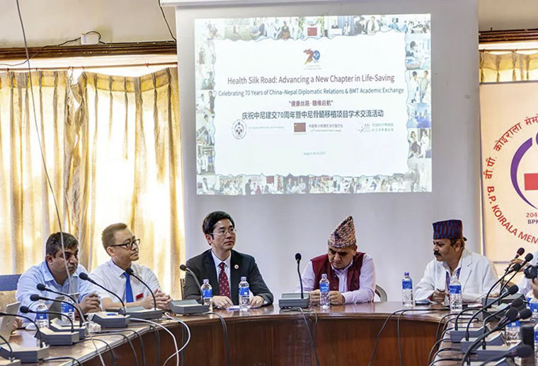8月19日,第16批援尼泊爾中國醫療隊、我院骨髓移植專家項目組與B.P.柯伊拉臘紀念腫瘤醫院在尼泊爾共同舉辦“健康絲路 髓緣啟航”慶祝中尼建交70周年暨中國骨髓移植項目學術交流活動。中國駐尼泊爾大使館王欣參贊出席活動并致辭,中尼兩國醫療專家齊聚共商醫療合作。