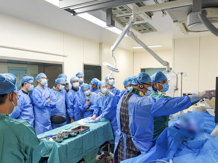 為強化實操性,我院心臟血管外科聯合麻醉科、介入手術室等多學科團隊現場演示4臺復雜主動脈手術,其中兩臺為A型主動脈夾層雜交治療,2臺為胸主動脈微孔技術重建弓上三分支。兩臺A型夾層通過肋間小切口完成升主動脈替換,同時通過介入微孔技術重建主動脈弓上三分支,避免了術中人工血管置換主動脈弓,縮減了大量手術時間,減少了手術創傷,為A型主動脈夾層的治療提供了一種新的手術思路。