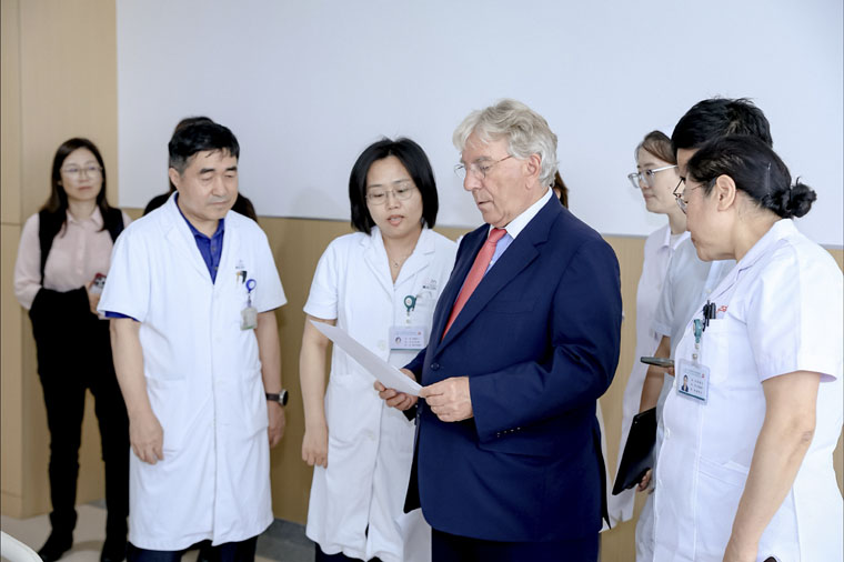 會前,Untch教授先后走訪了東院區放療科、病理科及乳腺中心臨床研究病房。在放療機房,他與醫護團隊圍繞乳腺癌、宮頸癌患者放射治療方案展開實時病例研討;在河北省數智病理中心,對該中心基于超千萬張病理圖像構建的高質量數據集及高效處理多類臨床診斷任務的AI模型給予高度評價,并肯定了遠程病理會診平臺的建設成果。隨后,Untch教授深入臨床研究病房,對三位年輕晚期乳腺癌患者進行教學查房,以嚴謹的學術態度和人文關懷與患者溝通病情,提出國際化治療建議,其專業素養獲醫患一致贊譽。