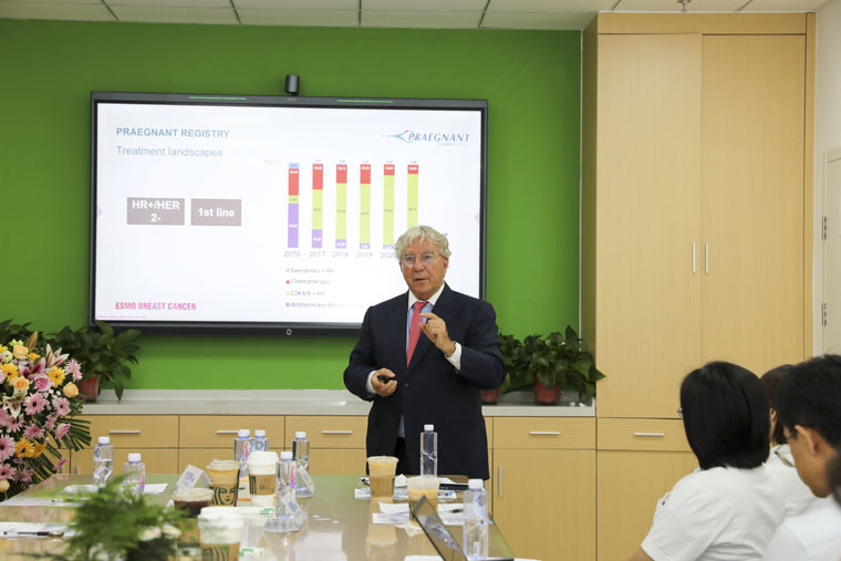 近日,我院乳腺中心舉辦了“國際醫學交流·寰球對話”第四期學術活動,特別邀請多項全球乳腺癌臨床研究的主要研究者(Leading PI)、德國Berlin-Buch Helios(柏林布赫赫利奧斯)醫院婦產科及乳腺癌跨學科研究中心主任Michael Untch教授來訪,通過多環節的學術與實踐交流,為我院乳腺癌診療與國際合作注入新動能。