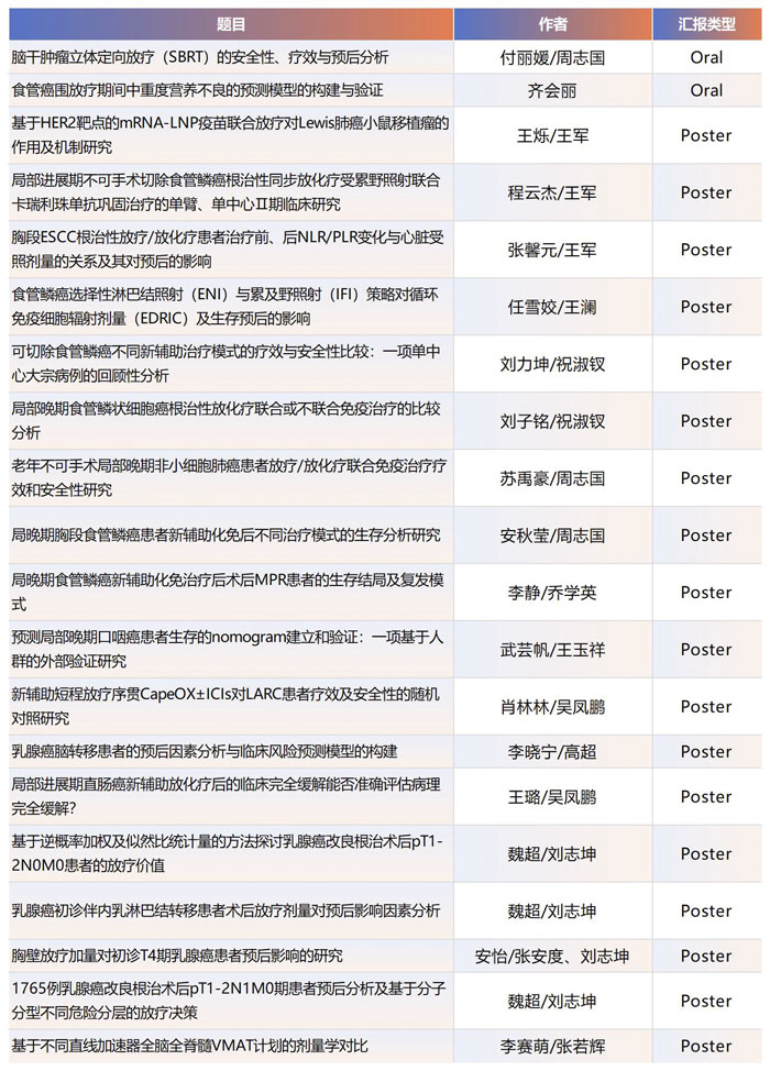 中華醫學會放射腫瘤治療學學術會議作為我國放射腫瘤治療領域的頂級學術盛會之一,匯聚了全國醫療機構及科研單位的專家學者,旨在展示前沿研究成果,推動放射腫瘤治療技術創新與臨床應用深度融合。本次公布的我院研究成果涵蓋食管癌、肺癌、乳腺癌、頭頸部腫瘤、直腸癌、婦科腫瘤及放療技術應用等多個關鍵領域,其中2項研究被選為大會口頭發言,18項成果以poster形式展示,56項成果通過書面交流形式分享,全面展現了科室在臨床與科研領域的多維突破。