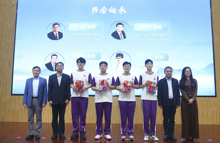 活動現場還舉行了“致敬榜樣”儀式,學子為專家頒發“育人楷模”獎杯并獻花,感謝他們深耕教育、傾囊相授的奉獻精神。我院麻醉二科主任李超、河北醫科大學第二醫院麻醉科主任黃立寧、河北省人民醫院副院長李建立、河北醫科大學第一醫院麻醉科主任王莉為學生代表授書,寄語青年學子“賡續醫學薪火,傳承書香文脈”。