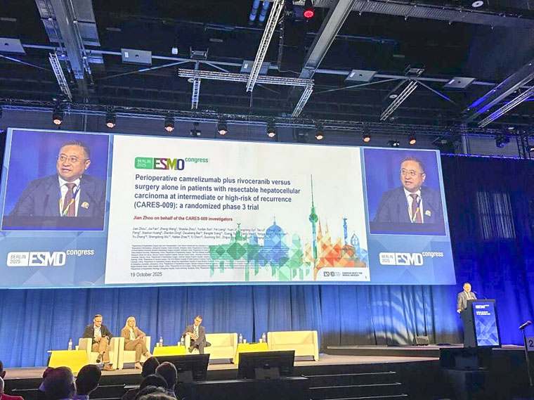 近日,由復旦大學附屬中山醫院樊嘉院士指導、周儉教授牽頭,我院作為重要分中心參與的大型國際多中心臨床研究CARES-009成果在2025年歐洲腫瘤內科學會(ESMO)年會上重磅發布,我院副院長彭利教授團隊受邀以線上形式全程參與ESMO年會的數據發布儀式,研究結果同步在線發表于國際頂級醫學期刊《柳葉刀》(The Lancet)。該研究是全球首個在肝癌圍手術期Ⅲ期臨床試驗中取得陽性結果的突破性研究,標志著肝癌治療正式邁入“慢病化管理”與“追求治愈”的新時代,充分彰顯我院臨床科研實力,獲得國際同行高度認可。