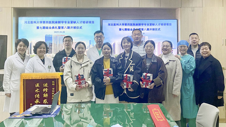近日,我院舉辦了麻醉專業緊缺人才培訓項目第七期結業典禮暨第八期開班儀式。教務處處長張曼,麻醉科各位主任、帶教老師和全體學員參加活動。