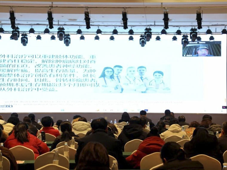 我院黨委副書記、紀(jì)委書記李曉玲,河北省平鄉(xiāng)縣人民醫(yī)院院長(zhǎng)王艷君,九三學(xué)社市委駐會(huì)主委王丹等為活動(dòng)致辭。我院腫瘤內(nèi)科主任史健、中西醫(yī)結(jié)合腫瘤科負(fù)責(zé)人霍炳杰、骨科主任荀建軍、腫瘤內(nèi)科腫瘤學(xué)博士段曉陽(yáng)分別圍繞“執(zhí)簡(jiǎn)馭繁的辨證論治規(guī)律——讓中醫(yī)診療普惠患者”“中西醫(yī)結(jié)合治療惡性腫瘤的經(jīng)驗(yàn)”“腫瘤骨轉(zhuǎn)移治療策略”“中西醫(yī)結(jié)合時(shí)代國(guó)家腫瘤質(zhì)控指標(biāo)解讀”等主題展開授課。