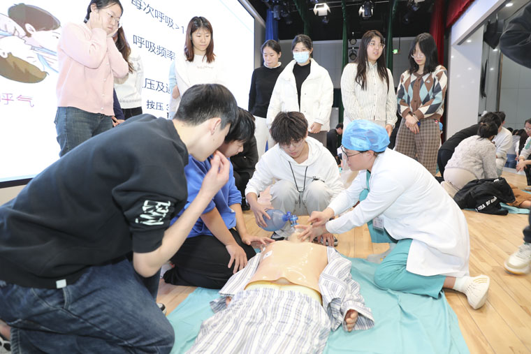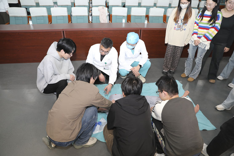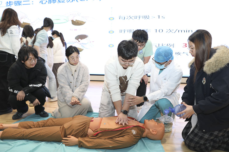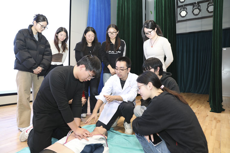 醫(yī)院工會梁勇老師分享了自己在參加馬拉松時突發(fā)心臟驟停、因現(xiàn)場急救及時而獲救的經(jīng)歷。這段“重生”經(jīng)歷讓在場師生深刻體會到急救技能的重要性,以及“醫(yī)者仁心”的職業(yè)精神。
