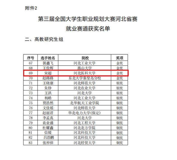 近日,第三屆全國大學生職業(yè)規(guī)劃大賽河北省大學生職業(yè)規(guī)劃大賽決賽在燕山大學落幕,我院2023級普外科專碩研究生宋超憑借扎實的專業(yè)積淀、清晰的職業(yè)定位與出色的現(xiàn)場表現(xiàn),在眾多參賽選手的激烈角逐中脫穎而出,成功斬獲高教組就業(yè)賽道省級金獎,為學校與醫(yī)院贏得了榮譽,彰顯了我院學子深耕醫(yī)學領(lǐng)域、規(guī)劃職業(yè)未來的青春風采。