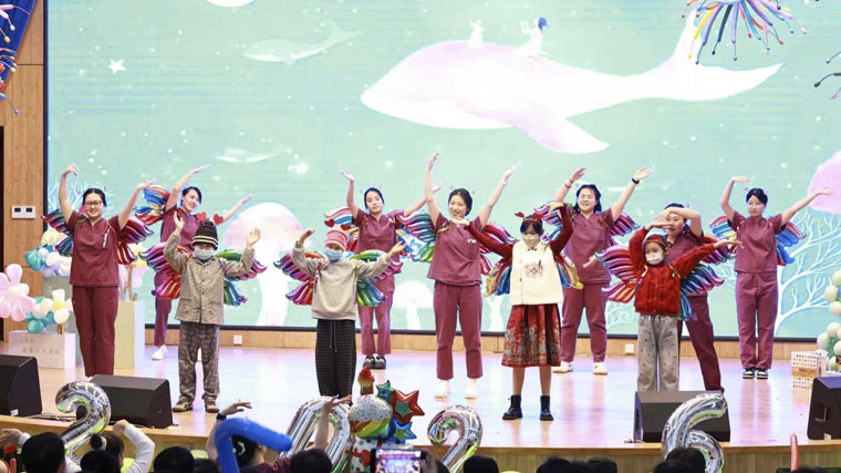 隨后,一場精心編排的視聽盛宴正式拉開帷幕。兒科醫(yī)護(hù)人員與孩子們身著特色服飾、佩戴五彩翅膀攜手登臺,共同演繹舞蹈《把未來點(diǎn)亮》,“把未來點(diǎn)亮,讓夢想起航,每一束光都照亮希望的方向”,悠揚(yáng)的旋律搭配真摯的演繹,歌詞里的美好期許與孩子們眼中的憧憬相互映照,孩子們揮舞著手臂,臉上洋溢著自信與快樂,構(gòu)成了現(xiàn)場最治愈的畫面。