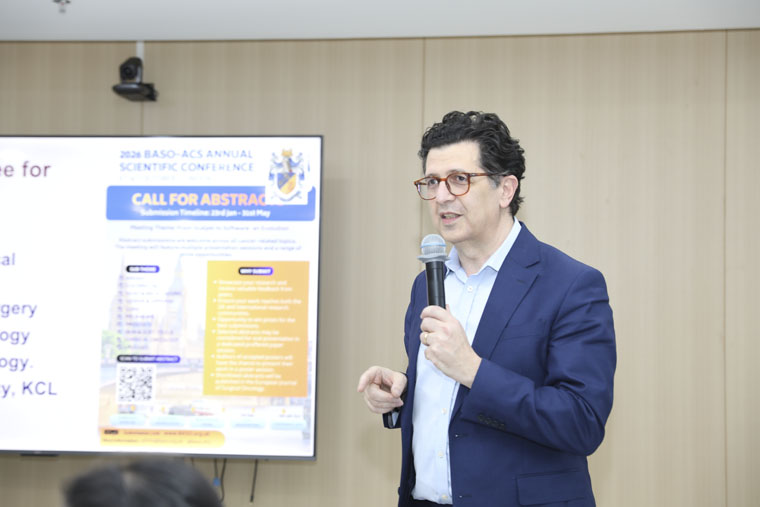 學(xué)術(shù)交流環(huán)節(jié)由乳腺中心周濤教授主持。宋振川教授代表乳腺中心作科室介紹,全面展示了我院乳腺中心的診療特色與技術(shù)實力。隨后,Michael Douek教授以《英國乳房重建與機器人手術(shù)現(xiàn)狀》為題,系統(tǒng)分享了英國在乳腺重建術(shù)式創(chuàng)新、機器人手術(shù)推廣應(yīng)用、長期療效隨訪等方面的最新成果,深入解析了植入物與自體組織重建的臨床決策要點及并發(fā)癥管理策略。我院王新樂副主任醫(yī)師、唐甜甜副主任醫(yī)師、李若陽主治醫(yī)師等分別圍繞“保乳整形術(shù)式優(yōu)化”“復(fù)雜乳房重建病例診療經(jīng)驗”等主題展開分享,結(jié)合臨床實例與Michael Douek教授就手術(shù)技術(shù)改良、患者預(yù)后提升、臨床研究設(shè)計等進行深度研討,現(xiàn)場思想碰撞激烈,學(xué)術(shù)氛圍濃厚。討論環(huán)節(jié)聚焦腔鏡與機器人手術(shù)的學(xué)習(xí)曲線優(yōu)化、保乳手術(shù)的腫瘤安全邊界與美學(xué)平衡等臨床關(guān)鍵問題,中外專家各抒己見,既分享了成熟經(jīng)驗,也探討了當(dāng)前診療中的共性挑戰(zhàn),為雙方后續(xù)開展聯(lián)合研究、技術(shù)互鑒奠定了堅實基礎(chǔ)。